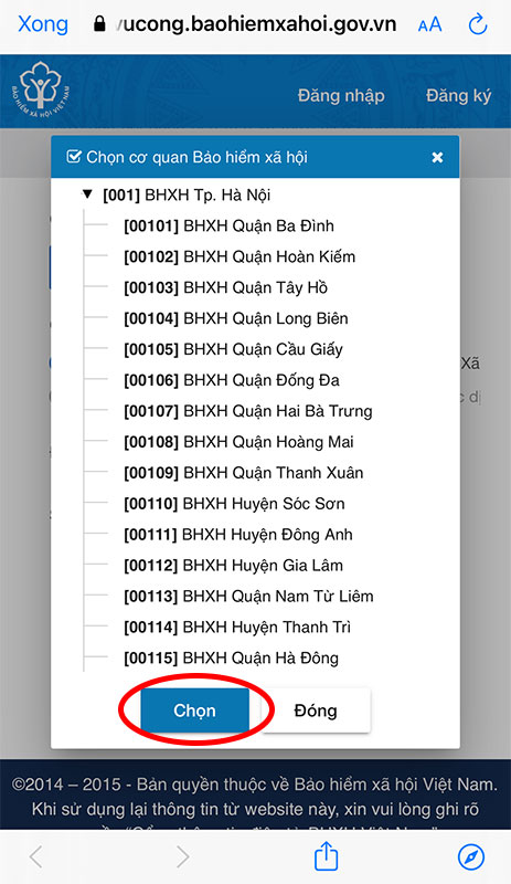 Ở phần chọn Cơ quan Bảo hiểm xã hội, các bạn chọn cơ quan nơi mình đã đăng ký BHXH (Ví dụ Thành phố Hà Nội, Quận Cầu Giấy) sau đó nhấn nút Chọn.
