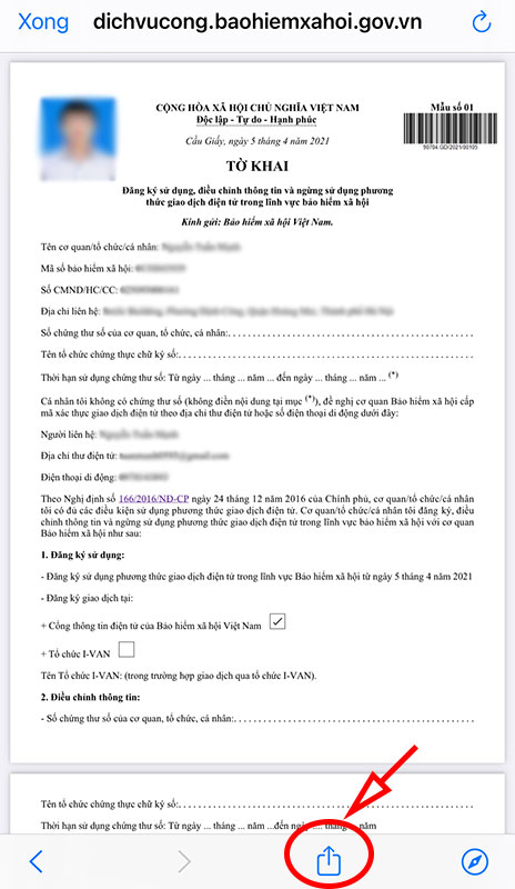 Sau khi hoàn thành việc đăng ký online, màn hình sẽ hiển thị lại thông tin của người đăng ký. Lúc này, các bạn sẽ cần in tờ khai này ra để nộp cho cơ quan BHXH đã đăng ký. Đối với điện thoại dùng iOS, các bạn nhấn chọn nút Upload ở dưới màn hình.