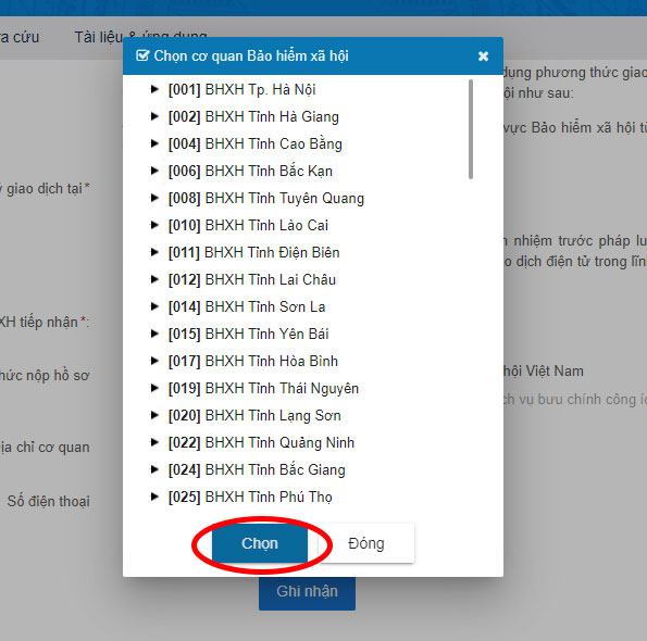 Sau khi điền xong, hãy chọn cơ quan BHXH tiếp nhận (Ví dụ BHXH Thành phố Hà Nội - Quận Cầu Giấy) sau đó nhấn nút Chọn.