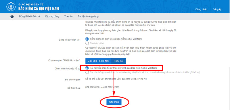 Tích chọn hình thức nộp hồ sơ là Tại nơi tiếp nhận hồ sơ theo quy định của Bảo hiểm xã hội. Nếu các bạn nộp hồ sơ tại nhà hoặc cơ quan thì sẽ mất phí bưu điện và sẽ mất thời gian hơn nhiều so với việc nộp trực tiếp. Cuối cùng hãy nhấn nút Ghi nhận hệ thống lưu hồ sơ của bạn.
