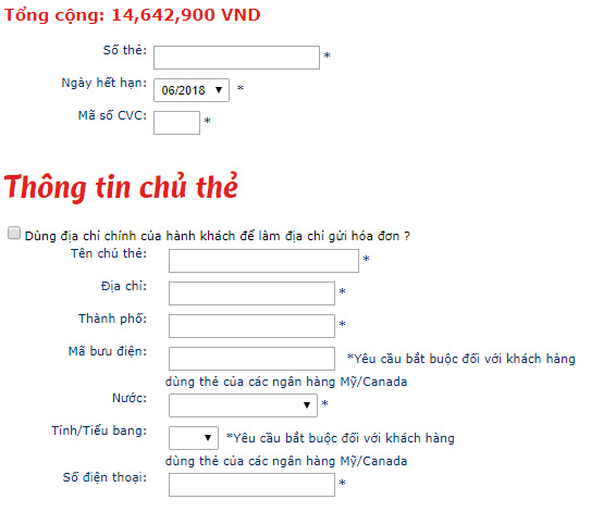 Bước 7: Nếu đã hợp lý, đánh dấu tick vào Hình thức thanh toán để chọn loại thẻ mà bạn sẽ sử dụng để thanh toán, đồng thời điền các thông tin liên quan tới thẻ và chủ thẻ để tiến hành.