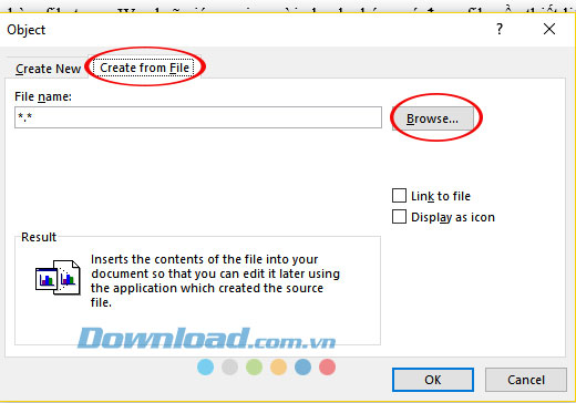Cửa sổ Obiect xuất hiện hãy chọn sang tab Create from File.