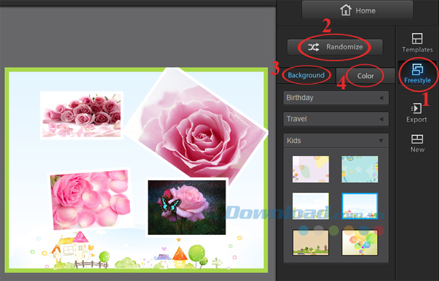 Bước 5: Còn muốn đảo ảnh theo vị trí khác nhau thì nhấn vào FreeStyle ở cột bên phải màn hình. Nhấn vào Randomize ảnh sẽ được đảo theo vị trí khác nhau, bạn thấy kiểu nào phù hợp với mình thì chọn.