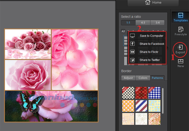 Bước 6: Sau khi hoàn tất quá trình ghép ảnh, nhấn vào Export để lưu vào máy tính hoặc chia sẻ lên các trang mạng xã hội như: Facebook, Twitter hay Flickr.