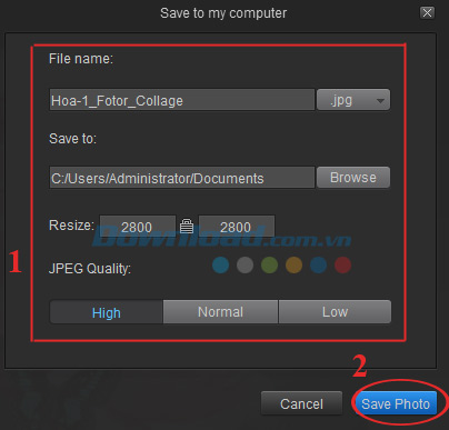 Bước 7: Cửa sổ Save to my computer xuất hiện. Tại đây bạn có thể đặt tên ảnh, chọn định dạng ảnh, chọn nơi lưu trữ, chọn kích thước và chất lượng ảnh. Sau đó nhấn Save Photo để lưu lại.