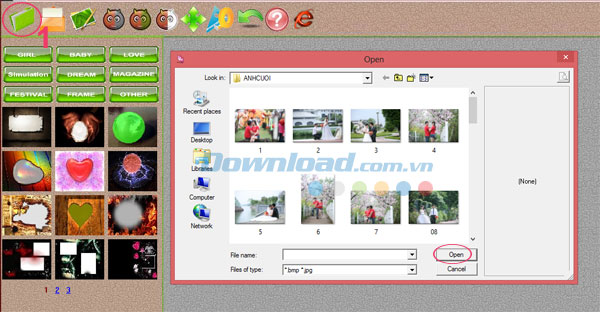 Và giờ bắt đầu nhập hình ảnh mong muốn vào cửa sổ chính của PhotoShine. Đơn giản, chỉ cần nhấp chuột vào biểu tượng 1 để chọn ảnh trong máy tính. Sau khi chọn xong ảnh, nhấn Open.