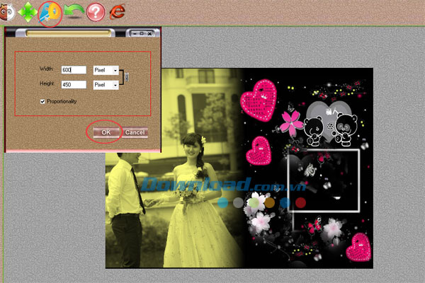 Nhấn chuột vào tùy chọn Resize và nhập chiều cao và chiều rộng của ảnh được tính theo đơn vị pixel. Sau đó, bấm Ok để kết thúc.