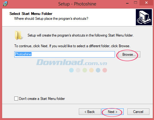 Sau đó, chọn thư mục Start Menu để đặt phím tắt sử dụng chương trình PhotoShine vào đó. Để tiếp tục, vui lòng nhấn Next. Thư mục mặc định ở đây sẽ là: PhotoShine. Nếu muốn chọn một thư mục khác, bấm Browse.