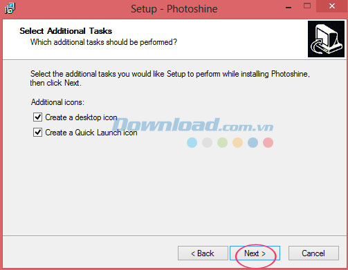 Cửa sổ sau đó sẽ cho phép bạn lựa chọn thêm một số tác vụ cần được thực hiện trong khi đang tiến hành cài đặt PhotoShine trên máy tính. Nhấn Next để tiếp tục.