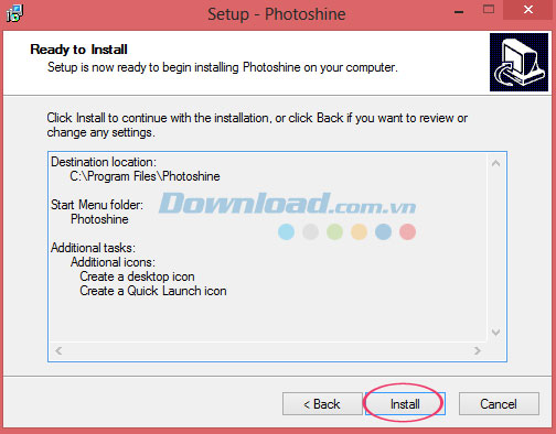 Và giờ là thời điểm để bạn bắt đầu cài đặt PhotoShine trên máy tính của mình. Nhấn Install để tiếp tục việc cài hoặc chọn Back khi muốn xem xét hoặc thay đổi bất cứ cài đặt nào.