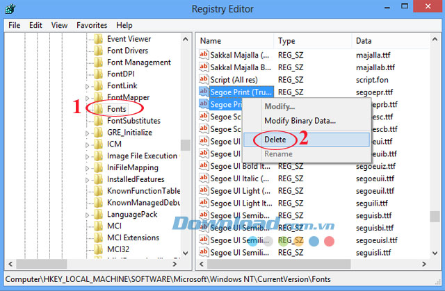 Nhìn sang phía bên phải màn hình tìm font Segoe Print (TrueType) và Segoe Print Bold (TrueType), nhấn chuột phải chọn Delete để xóa font đó đi.
