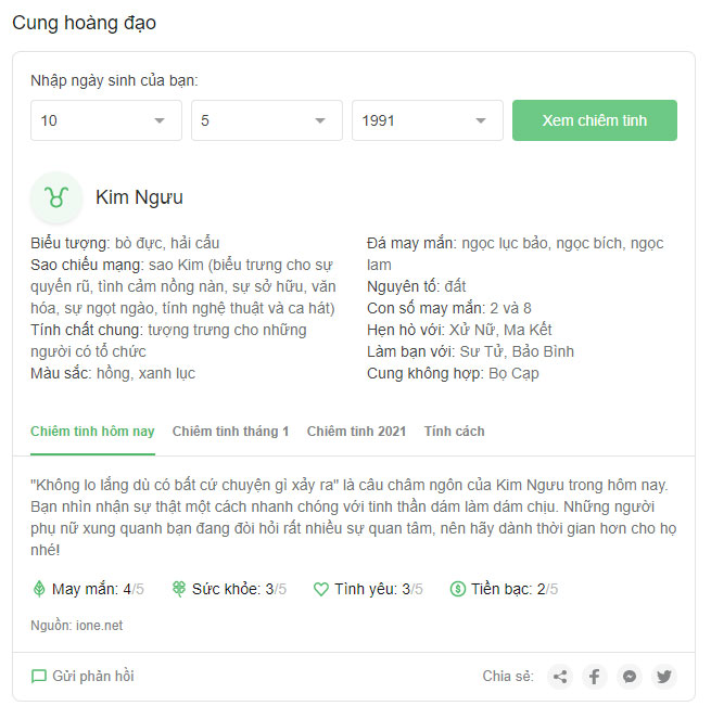 Lúc này các thông tin về cung hoàng đạo sẽ hiện ra dựa theo ngày tháng năm sinh bạn nhập. Các bạn cũng có thể nhấn vào phần Chiêm tinh hôm nay, Chiêm tinh tháng..., Chiêm tinh năm... và Tính cách để xem thêm các thông tin liên quan đến cung hoàng đạo.