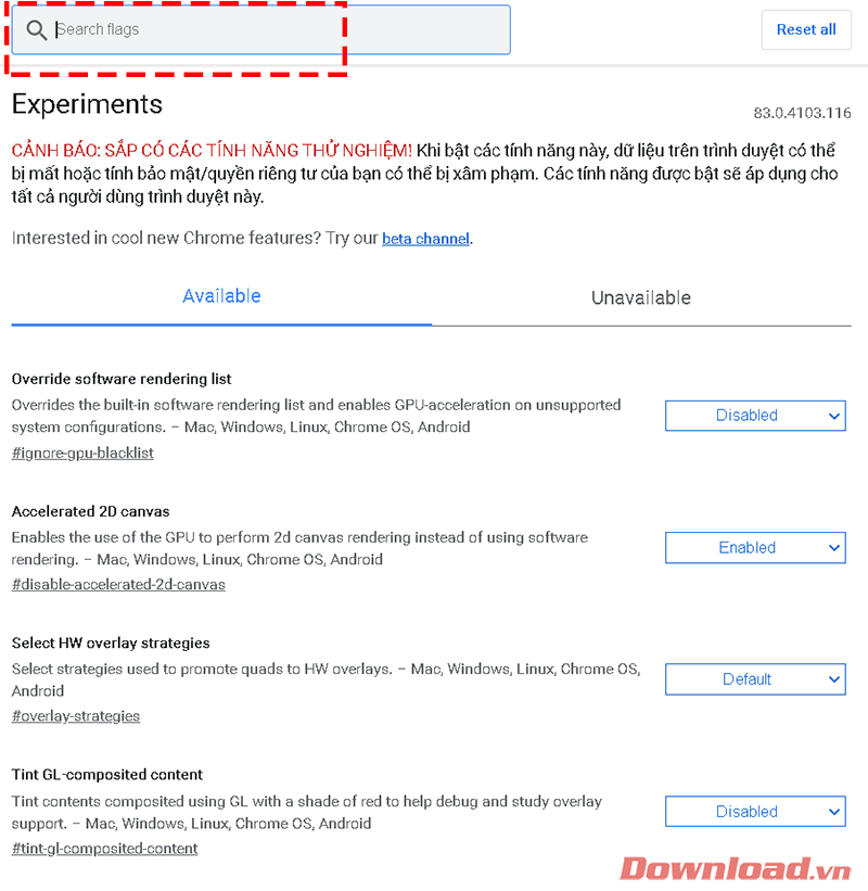 Đầu tiên các bạn hãy mở Chrome lên và gõ vào thanh địa chỉ câu lệnh: chrome://flags/ sau đó nhấn Enter để truy cập vào mục quản lý các tính năng thử nghiệm. Tại đây hãy chuyển con trỏ về phần tìm kiếm Search flags.