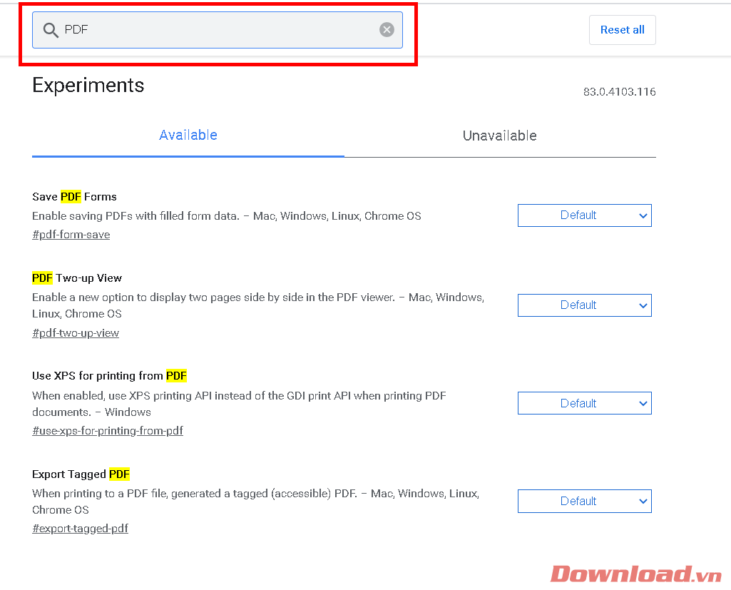 Trong phần tìm kiếm, hãy đánh vào PDF để tìm kiếm những tính năng liên quan đến PDF sau đó nhấn Enter. Lúc này các dòng tính năng liên quan đến PDF sẽ hiện ra, đồng thời cũng thông báo rằng tính năng có tác dụng với HĐH Mac, Windows, Linux và Chrome OS.