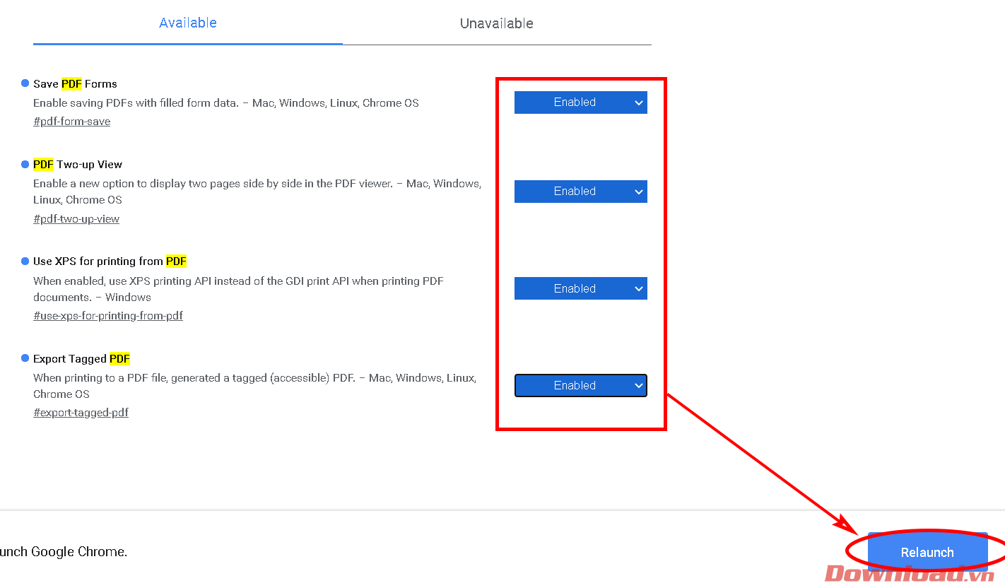 Nhấn chuột vào phần tùy chọn ở cuối các dòng và chọn Enable để kích hoạt, sau đó nhấn nút Relaunch để khởi động lại trình duyệt.