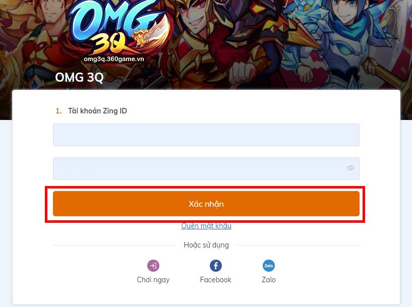 Đầu tiên các bạn truy cập vào website nạp thẻ của Zing: https://pay.zing.vn/product/omg. Nhập tên tài khoản và mật khẩu đăng nhập vào ô trống sau đó nhấn Xác nhận.