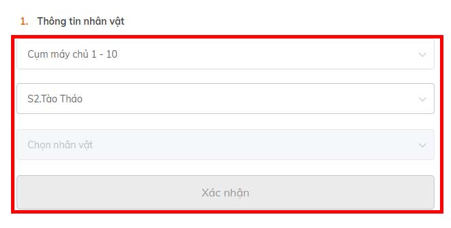Điền thông tin nhân vật mốnn nạp thẻ gồm có:
