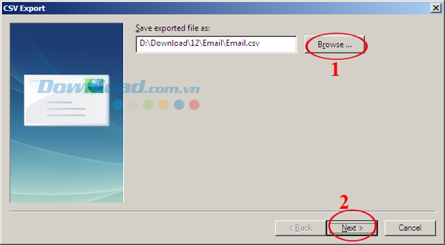 Bước 3: Nhấn vào nút Browse... ở mục Save exported file as để đặt tên và nơi lưu trữ. Sau đó nhấp chuột vào Next để tiếp tục.