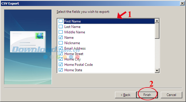 Bước 4: Cửa sổ này cho phép bạn lựa chọn các trường muốn lưu trữ, rồi nhấn Finish để kết thúc quá trình sao lưu danh bạ.