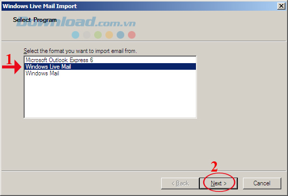 Bước 2: Sau đó chọn Windows Live Mail, rồi nhấn Next để chuyển sang bước tiếp theo.