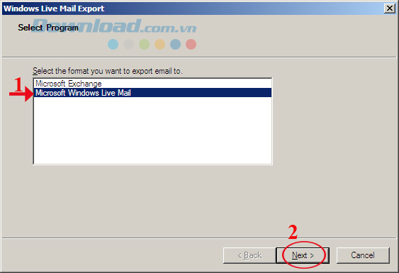Bước 2: Cửa sổ mới xuất hiện cho phép bạn lựa chọn chương trình sao lưu. Ở mục Select the format you want to export email to chọn Microsoft Windows Live Mail. Sau đó nhấn Next để tiếp tục.