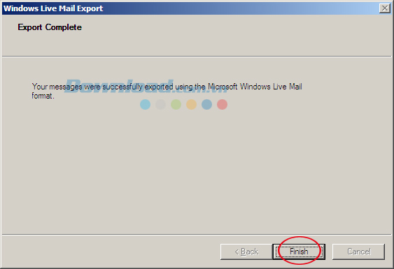 Bước 5: Quá trình sao lưu nhanh hay chậm còn tùy thuộc vào số lượng email. Khi quá trình sao lưu Windows Live Mail hoàn tất, nhấn chuột vào Finish để kết thúc.