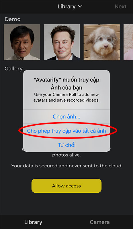 Chọn tiếp nút Cho phép truy cập vào tất cả ảnh để cho phép ứng dụng truy cập vào thư viện ảnh.