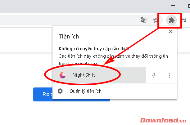 Sau khi đã thêm vào Chrome, các bạn hãy nhấn vào biểu tượng tiện ích (Extension) ở góc trên bên phải trình duyệt và nhấn chọn tiện ích Night Shift.