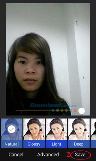 Bước 1: Mở Camera360 lên, chúng ta sẽ có giao diện chuẩn bị chụp ảnh như hình dưới, bạn hãy chạm tay vào nút tròn màu vàng ở giữa để chụp ảnh. Sau đó, sẽ xuất hiện cửa sổ cho bạn thêm hiệu ứng cho bức ảnh thêm sinh động, tại đây có 10 loại hiệu ứng cho bạn lựa chọn, nếu cảm thấy ưng ý rồi thì nhấn Save để lưu lại bức ảnh đó. Nếu muốn xem lại những kiểu ảnh đã chụp và chỉnh sửa chúng thì nhấn vào bộ sưu tập ảnh ở góc dưới cùng bên trái màn hình.