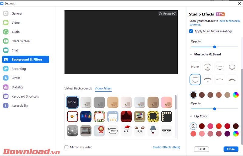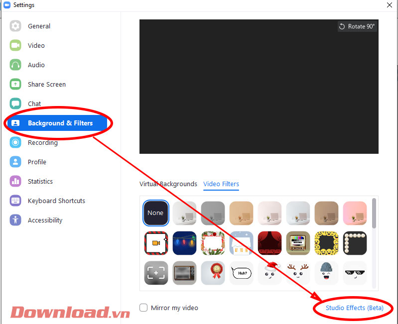 Chọn tab Background & Filters ở menu bên tay trái. Chọn tiếp phần Video Filters. Lúc này, bạn sẽ thấy một số hiệu ứng nền xuất hiện để người dùng lựa chọn. Nếu muốn chỉnh sửa khuôn mặt, ta nhấn vào nút Studio Effects ở góc dưới bên phải (cần tải về trong lần chạy đầu tiên).