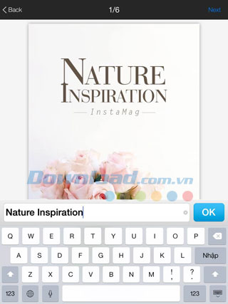 Nếu bạn muốn thiết kế album ảnh kèm âm thanh, đừng quên tính năng Music Book của InstaMag. Trên trang Styles sẽ có sẵn 8 mẫu album ảnh để bạn chọn. Ở giao diện bìa album ảnh, chạm vào tiêu đề ở dưới cùng màn hình để thay đổi (nếu muốn). Số lượng trang ảnh sẽ hiển thị ở phía trên cùng màn hình, ví dụ như style Nature Inspiration minh họa phía trên sẽ gồm 6 trang, trang bìa và 5 trang ảnh, mỗi trang chứa 1 hay vài ảnh.