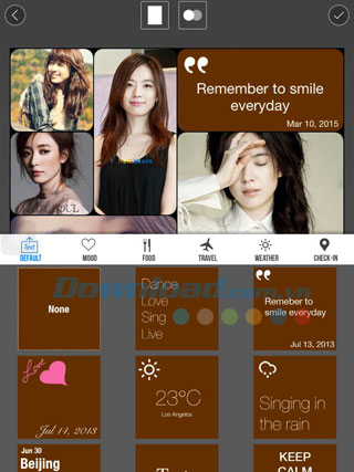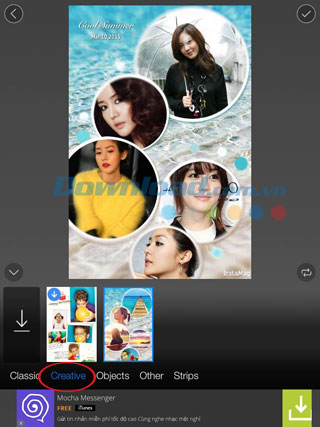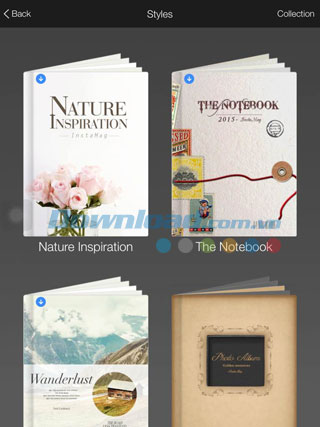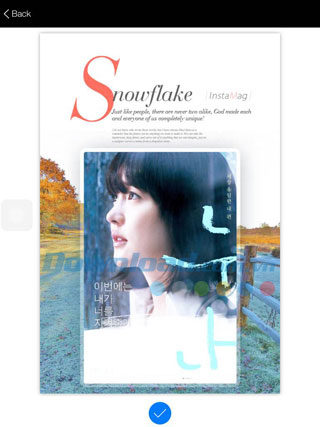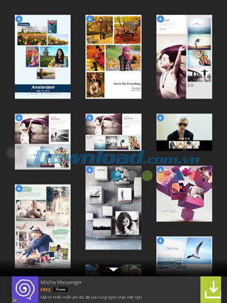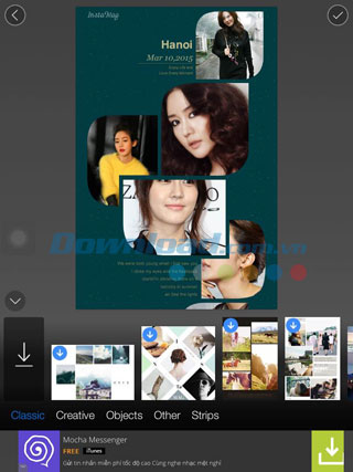 Các mẫu template Magazine được chia làm 5 danh mục: Classic, Creative, Objects, 3D và Strips. Mỗi danh mục lại có vô số template miễn phí để người dùng thỏa sức lựa chọn, hãy nhấn vào template bất kỳ để áp dụng trực tiếp lên ảnh. Nếu muốn khám phá thêm, nhấn chọn biểu tượng mũi tên tải xuống để xem rất nhiều template miễn phí trong cơ sở dữ liệu của InstaMag. Chạm vào một template để tải về máy rồi quay lại màn hình Magazine để xem mẫu template này hiển thị trên ảnh như thế nào.