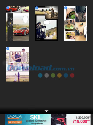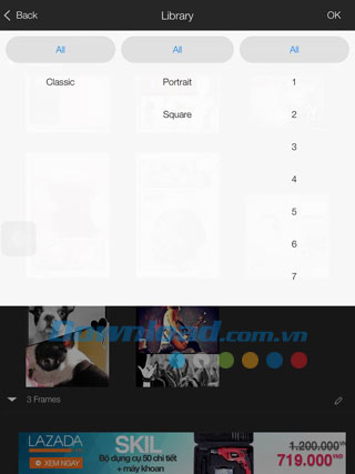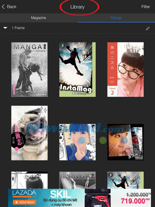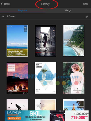 Ở mục thư viện ảnh (Library), bạn có thể sử dụng bộ lọc để tìm nhanh phong cách yêu thích của mình. Thư viện chia làm 2 mục: template phong cách tạp chí và tranh Manga. Mỗi loại gồm các template 1 ảnh cho tới 9 ảnh hoặc loại ảnh xếp dọc. Chạm vào template bất kỳ để chuyển sang màn hình Photos để chọn ảnh.