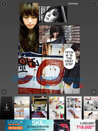 Nhấn và giữ rồi di chuyển ảnh trong một ô hoặc chạm vào ảnh để áp dụng bộ lọc, bạn cũng có thể nhấn biểu tượng 2 mũi tên ngược nhau ở bên dưới góc phải template để tráo đổi ảnh ngẫu nhiên.