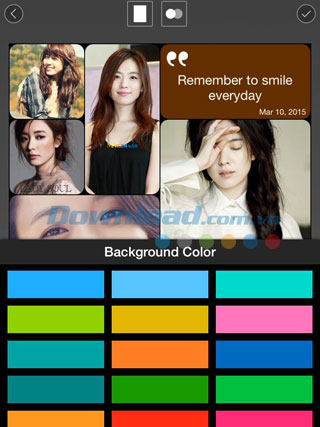 Thanh tính năng bên dưới khung ảnh lần lượt là: tạo góc bo tròn cho từng ảnh, thay đổi độ dày của đường viền ảnh, thay đổi màu nền, chèn các label thông tin lên ảnh theo chủ đề. Nhấn biểu tượng 2 mũi tên để tráo đổi vị trí ảnh cho nhau. Cuối cùng nhấn dấu tích ở góc trên bên phải màn hình để lưu ảnh tự động vào thư mục Photos của máy và chuyển sang màn hình Share. Bạn có thể chia sẻ ảnh một chạm qua mạng xã hội Instagram, Facebook, Twitter hoặc gửi qua Email.