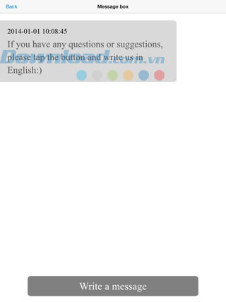 Nhấn biểu tượng dấu hỏi chấm ở góc trên bên phải màn hình chính để truy cập tính năng Message Box. Tại đây, bạn có thể nhập nội dung phản hồi, câu hỏi hay đề xuất để gửi tới nhà phát hành. Lưu ý phải viết bằng tiếng Anh. Chọn Write a message để chuyển sang giao diện thư. Sau khi nhập nội dung xong, nhấn Send để gửi đi hoặc Cancel để hủy.