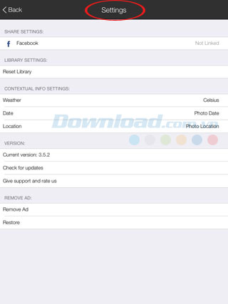 Biểu tượng 3 dấu gạch ngang ở góc trên bên phải màn hình thực đơn chính là tính năng thiết lập InstaMag. Người dùng có thể thiết lập chia sẻ bằng cách kết nối InstaMag với tài khoản Facebook của mình, thiết lập thư viện ảnh bằng cách reset lại thư viện cá nhân, các thiết lập thông tin ngữ cảnh bao gồm thời tiết - cài đặt đơn vị nhiệt độ C hoặc F, cài đặt ngày tháng theo ngày chụp ảnh hoặc ngày hiện tại, cài đặt địa điểm theo địa điểm chụp ảnh hay địa điểm hiện tại của bạn. Trong phần Settings, người dùng còn có thể xem thông tin về phiên bản InstaMag đang sử dụng, kiểm tra cập nhật từ cửa hàng App Store, hỗ trợ và đánh giá app, gỡ bỏ quảng cáo bằng cách mua gói IAP mất phí hay khôi phục lại các gói dữ liệu đã mua.