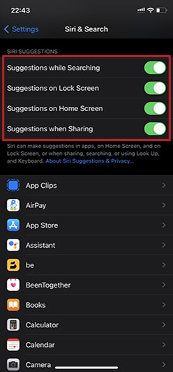 Trong Siri và Tìm kiếm hãy kéo xuống và chọn tab Gợi ý của Siri.