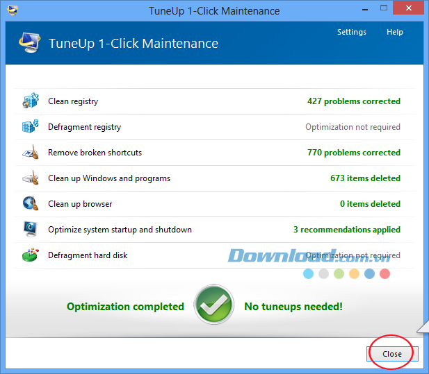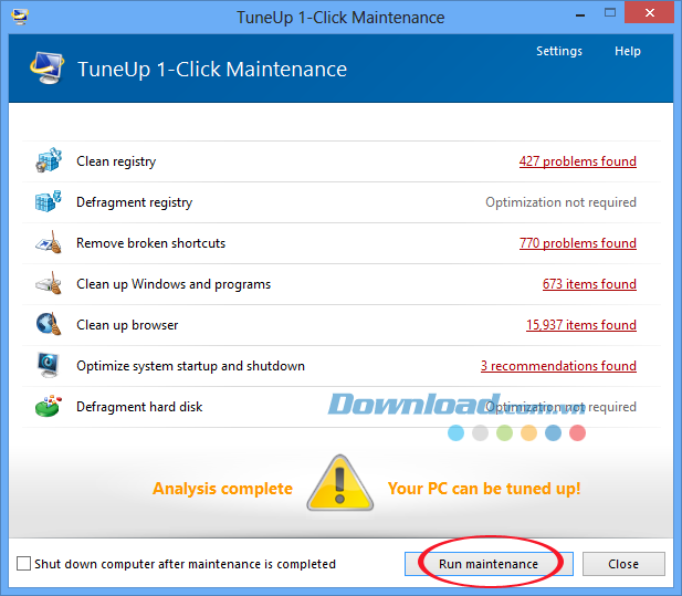 Chức năng TuneUp 1-Click Maintenance giúp bạn dọn dẹp, sửa lỗi hệ thống và nâng cao hiệu suất hoạt động chỉ với một lần click chuột mà không phải thiết lập gì cả.