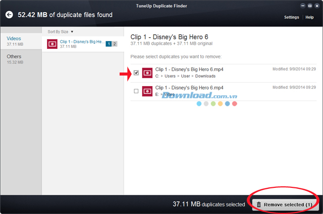 Tại đây bạn có thể xem chi tiết danh sách file được phân loại theo từng mục (Videos, Others), duyệt và tích chọn các file muốn xóa, sau đó nhấn nút Remove selected.
