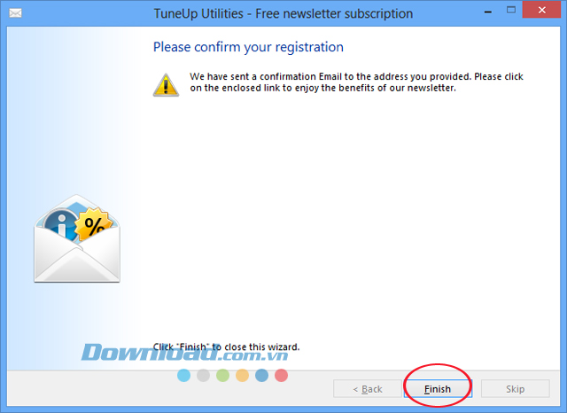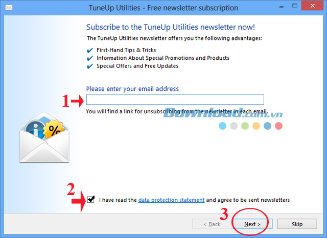Bước 4: Cửa sổ mới xuất hiện yêu cầu bạn nhập địa chỉ email vào ô Please enter your email address (chú ý phải là địa chỉ email thật) để nhà sản xuất gửi thông tin về phần mềm TuneUp Utilities vào đó.