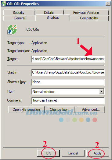 Bước 2: Cửa sổ Cốc Cốc Properties xuất hiện, thêm "--no-sandbox" vào cuối dòng .... browser.exe trong mục Target (chú ý thêm 2 dấu cách trước khi thêm "--no-sandbox"). Sau đó, nhấn Apply --> OK.