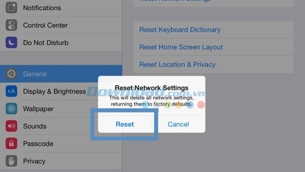 Ngay lúc này sẽ xuất hiện một ô thông báo nhỏ, rằng thao tác này sẽ xóa toàn bộ dữ liệu và cài đặt mạng đang có. Nếu vẫn muốn tiến hành, các bạn nhấn vào Reset, còn nếu không, có thể chọn Cancel để quay lại.