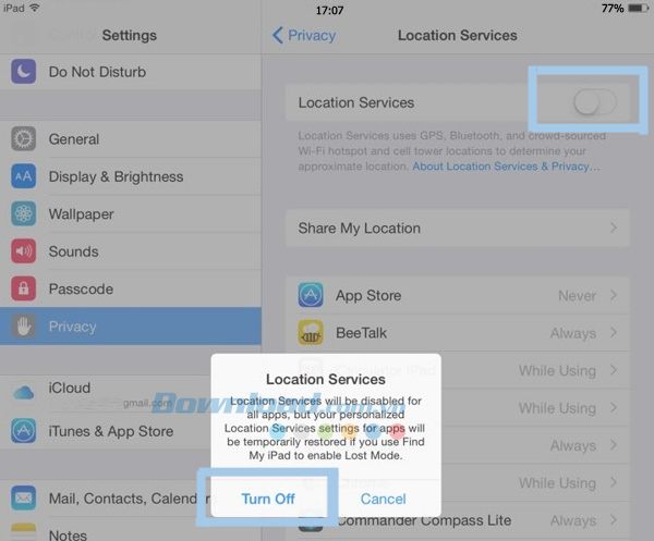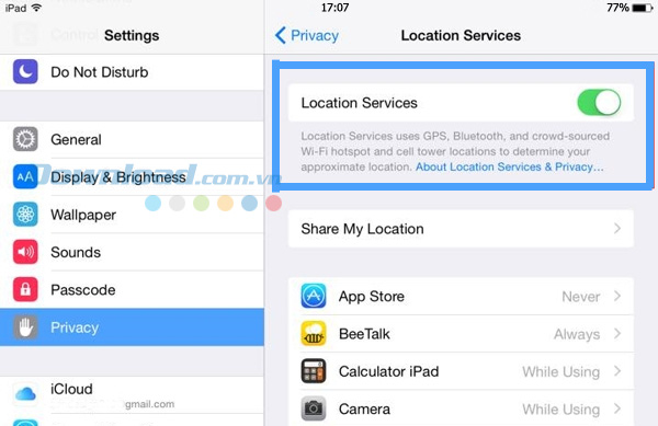 Đầu tiên, các bạn truy cập vào Settings, chọn mục Privacy, sau đó chọn tiếp mục Location Services. Tại đây, các bạn sẽ thấy một gạt để có thể tùy chỉnh tính năng này. Các bạn hãy tắt nó đi, bằng cách gạt nút tròn, màu trắng sang phía tay trái, lúc này thanh chứa nút gạt sẽ có màu xám (đã tắt).