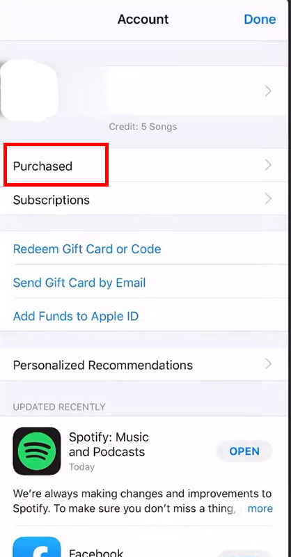 Trong phần quản lý tài khoản, ta nhấn tiếp vào mục Purchased. Đây là nơi lưu trữ tất cả những game và app mà bạn đã mua hoặc tải trước đây.