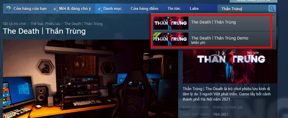 Ở hộp thoại tìm kiếm, nhập vào tên Thần Trùng sau đó nhấn chọn game The Death/Thần Trùng.