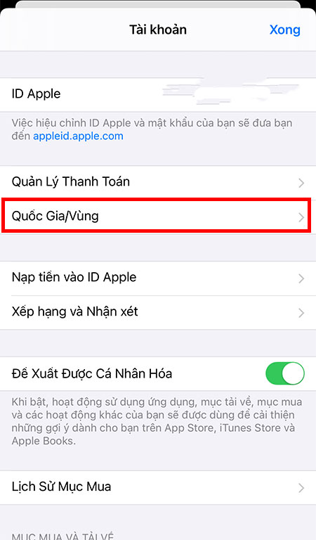 Để truy cập vào phần chuyển vùng quốc gia, các bạn vào App Store -> nhấn chọn biểu tượng avatar ở góc trên bên phải sau đó nhấn vào tên tài khoản Apple của bạn. Sau khi đăng nhập vào tài khoản Apple, nhấn chọn vào nút Quốc gia/Vùng.