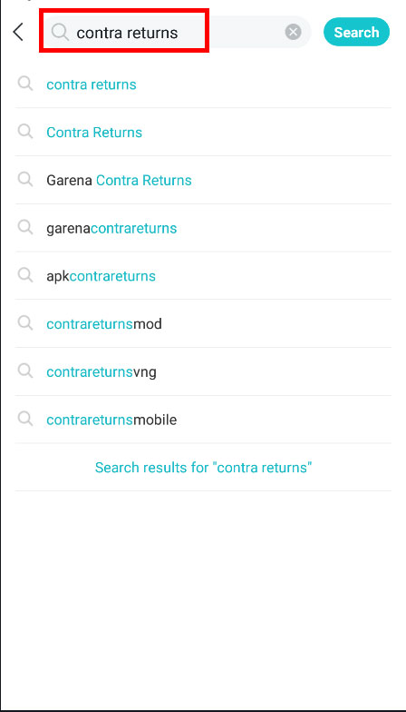 Sau khi cài Tap Tap, các bạn mở ứng dụng lên và vào phần Tìm kiếm ở phía trên màn hình. Đánh vào từ khóa Contra returns rồi nhấn Search hoặc nhấn vào kết quả đầu tiên hiện ra.