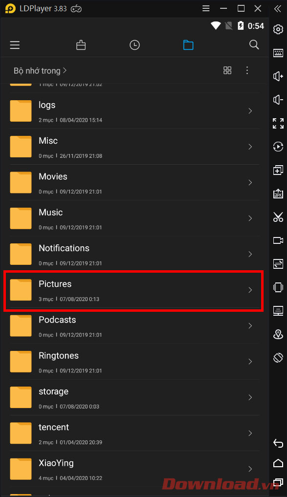 Bước 6: Mở ứng dụng quản lý tập tin lên, sau đó tìm đến thư mục Pictures. Đây là thư mục lưu trữ các file được chuyển từ máy tính vào trong LDPlayer. Các giả lập khác có thể sẽ có thư mục lưu trữ khác.