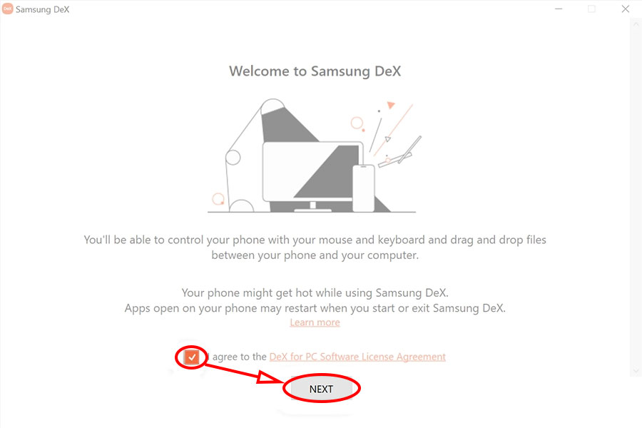 Sau khi tải xong, hẫy mở file cài đặt lên. Các bạn tích chọn vào dòng I agree to the DeX for PC... sau đó nhấn Next.